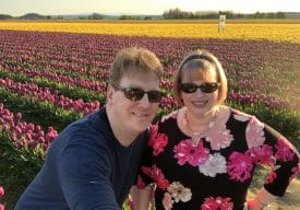 - Glenn and I pose in a windy field of tulips, Baker in background
