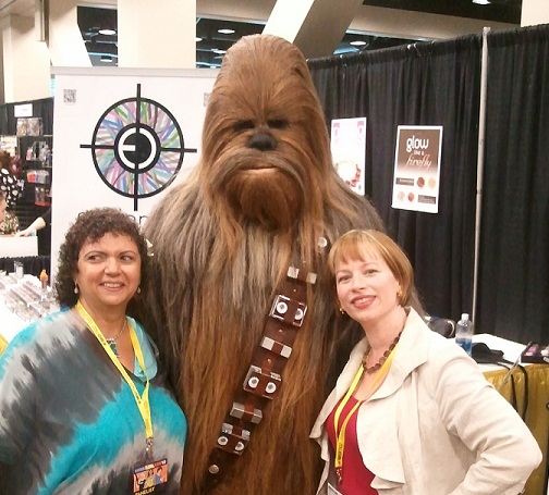 Two great meetings – the artist behind several comic books and the beautiful graphic novel relaunch of The Last Unicorn, Renae De Liz (check out her great rendering of Wonder Woman and the Womanthology, a collection of women comic book artists’ work she put together – a gorgeous hardback books with proceeds going to charity – from female artists, ages 7 to ninety something. There’s something incredibly beautiful about an anthology so inclusive, so lovingly put together. The other really exciting encounter for me was chatting with Buffy (and Once Upon a Time) writer Jane Espenson, and explaining to her how last year at the same con I was interviewed by a news-person who mistook me for her because we had signings at the same time. (All writers look alike to the media, I joked. Which might be sort of true.)