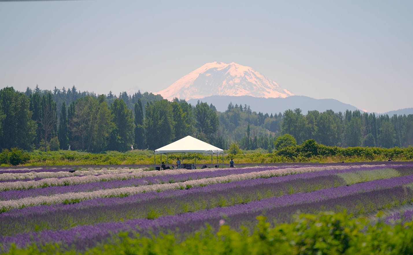 - view of the lavender farm (sprinkling) with Mt Rainier from Willows Lodge