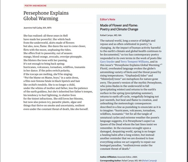 So excited about this publication, for several reasons. Excited that doctors will be reading this poem, one of a series that will form my next book. Excited for my parents, who, since I got a Biology degree, always wanted me to be a doctor – well, at least I can now say I was published in JAMA. And excited for the thoughtful editor’s note that accompanies the poem.