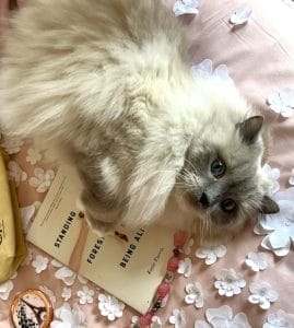 I mentioned reading Katie Farris’ moving and funny account of being diagnosed and treated for early breast cancer in her thirties, Standing in the Forest of Being Alive, from Alice James Books. I’ve always enjoyed Katie’s writing, but this book is really something special. Literary kitten Sylvia did a photo shoot with the book, and the outtake in on the left of paragraph, and the “real” shot is below. I think one of the things I love about the poetry community is how supportive we can be (not always are, but can be) towards each other. I love shouting out other poets’ terrific work, and the cats love to pose with poetry books (they like the attention, and they get treats after.)