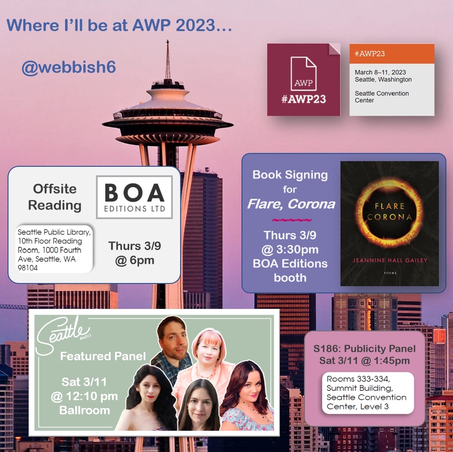 I’m starting to book readings and things into June! I’m up for virtual class visits (or in person, in the Seattle area) as well. If you want a signed copy, I’ll be signing them at the BOA table on the Thursday afternoon of AWP! And you can order your signed copy now here: Flare, Corona @ Webbish6.
