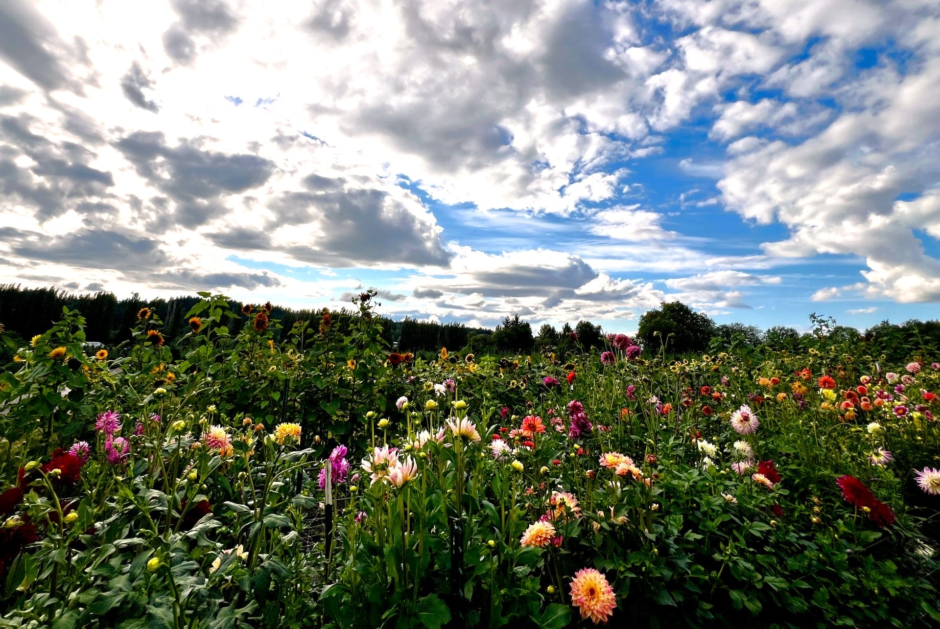 At all these fields of flowers, the finches have been twittering around us in the air. The hummingbirds are dwindling in number but still busy at the flowers as well. I’ll miss their bright colors and songs when the winter comes back. Some small parts of late summer are my favorite parts. (Wasps, not so much, but the birds, absolutely, and the blueberries in my garden this year—especially sweet.)