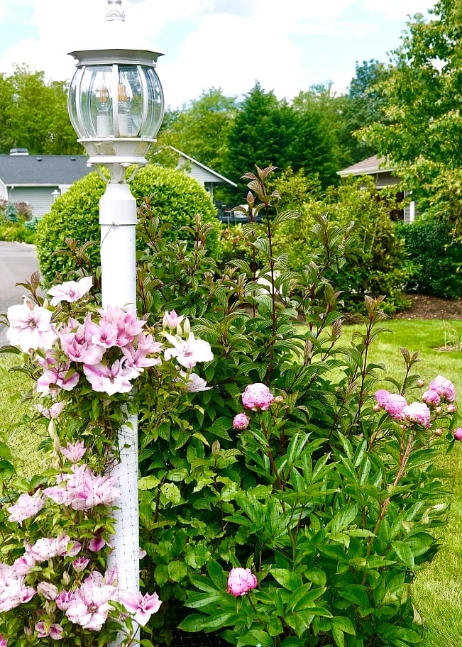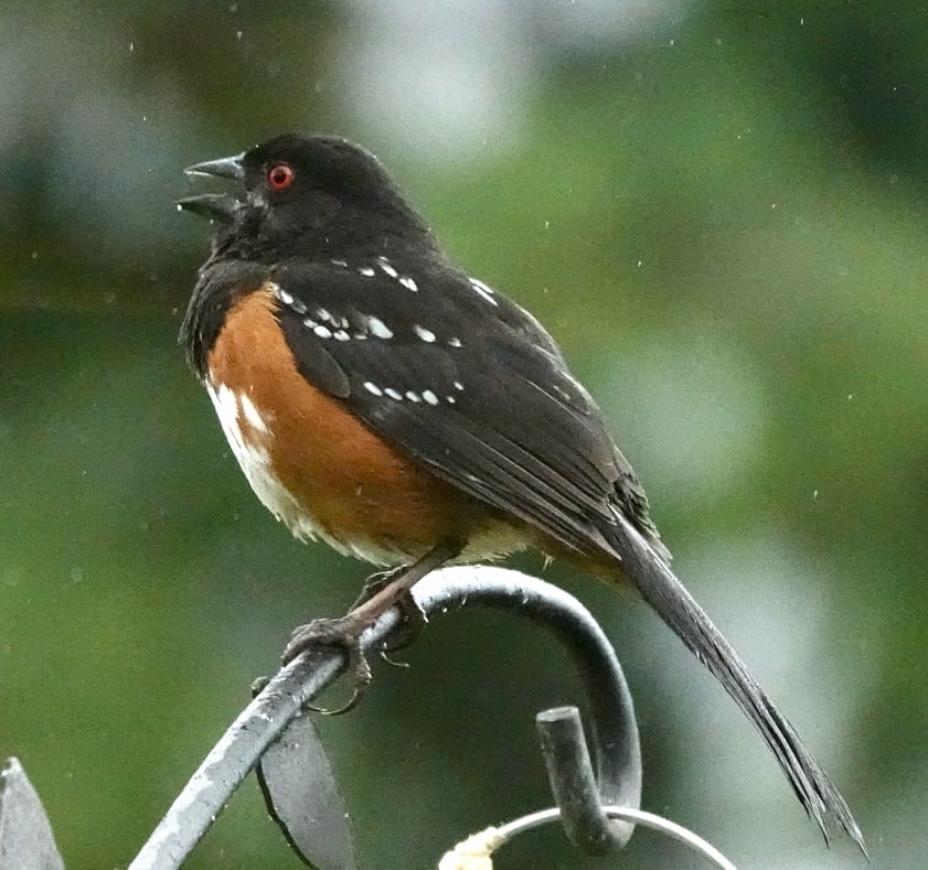 In the coldest and wettest spring (and now, almost summer) we’ve had here in 50 years, it’s been uniquely dispiriting to try to garden. My pink lady apple tree has black mold on its leaves; many of my perennials have died, along with my herbs like rosemary and sage, my roses (but not my neighbors’ roses?) continually eaten by deer. So here are a few pictures of the hard-won successes – a sunflower raised from saved seeds, my lamppost growing with pink clematis and peonies. It’s cold and gray today, again. I’ve had the flu this week (almost inevitable with the nasty weather), so I’m mostly indoors, not doing enough, not feeling productive. But the birds. even in the cold rain, have arrived faithfully. Here are a few pictures—goldfinch on fountain with sunflower, flying pileated woodpecker, cherry tree finch, and salvia with female rufous hummingbird.