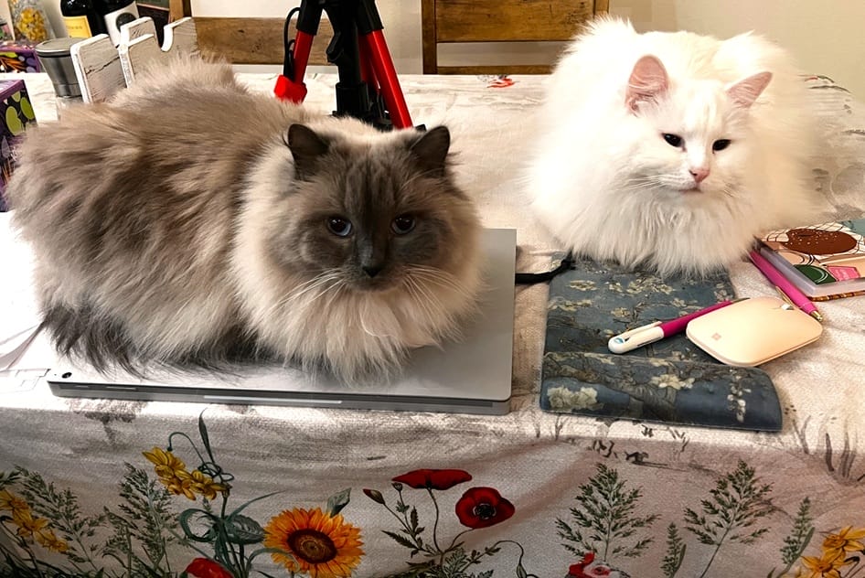 I’ve also finished up the essay class I was taking and wanted you to see where the cats are right after the Zoom class ends. The baby goldfinches and other birds have been fluttering about, and so too the Anna’s hummingbirds. My folks are coming into town in a week or so, and we’re cleaning out the spare room in the basement, donating items that have been taking up space (goodbye, old television set!) and I’ll be going to the endocrinologist and the endodontist this week (hooray) to check my thyroid and my back tooth. These crowns are so expensive and not covered by my insurance, so every time it’s like an expensive piece of jewelry or a nice fridge. (Boo…hiss….) I hope a future America with universal health insurance also covers dental health…which might be wishful thinking, as this horrid government continues to tear down everything good (this week, PBS and NPR). In the meantime, I’m still thinking about how to earn an independent living as a disabled writer in this economy where everyone is facing layoffs and inflation. I’m not doing the Sealey Challenge this year because of my family visiting, and I’m also judging the SFPA poetry contest, so I’ll have plenty on my plate. But I do love seeing other people’s reads!