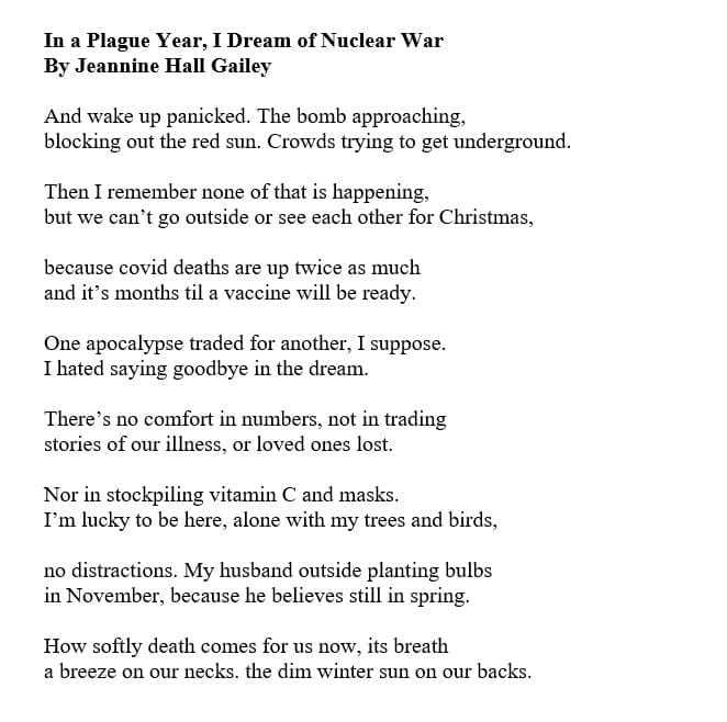 In the beginning of the pandemic, I dreamt repeatedly of nuclear war, and wrote this poem in response, which suddenly seems alarmingly prescient. I usually don’t post unpublished poems, but this one seemed timely. It may make its way into my newest book.