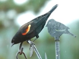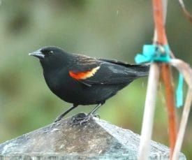 Our bird visitors this week included lots of Anna’s hummingbirds and a less common visitor – a red-winged blackbird. It was mostly rainy, as you can probably tell, which doesn’t make for the best pictures, but I thought you’d enjoy seeing them anyway. Also, my cat Sylvia with a Valentine’s Day ribbon, just to mix it up.
