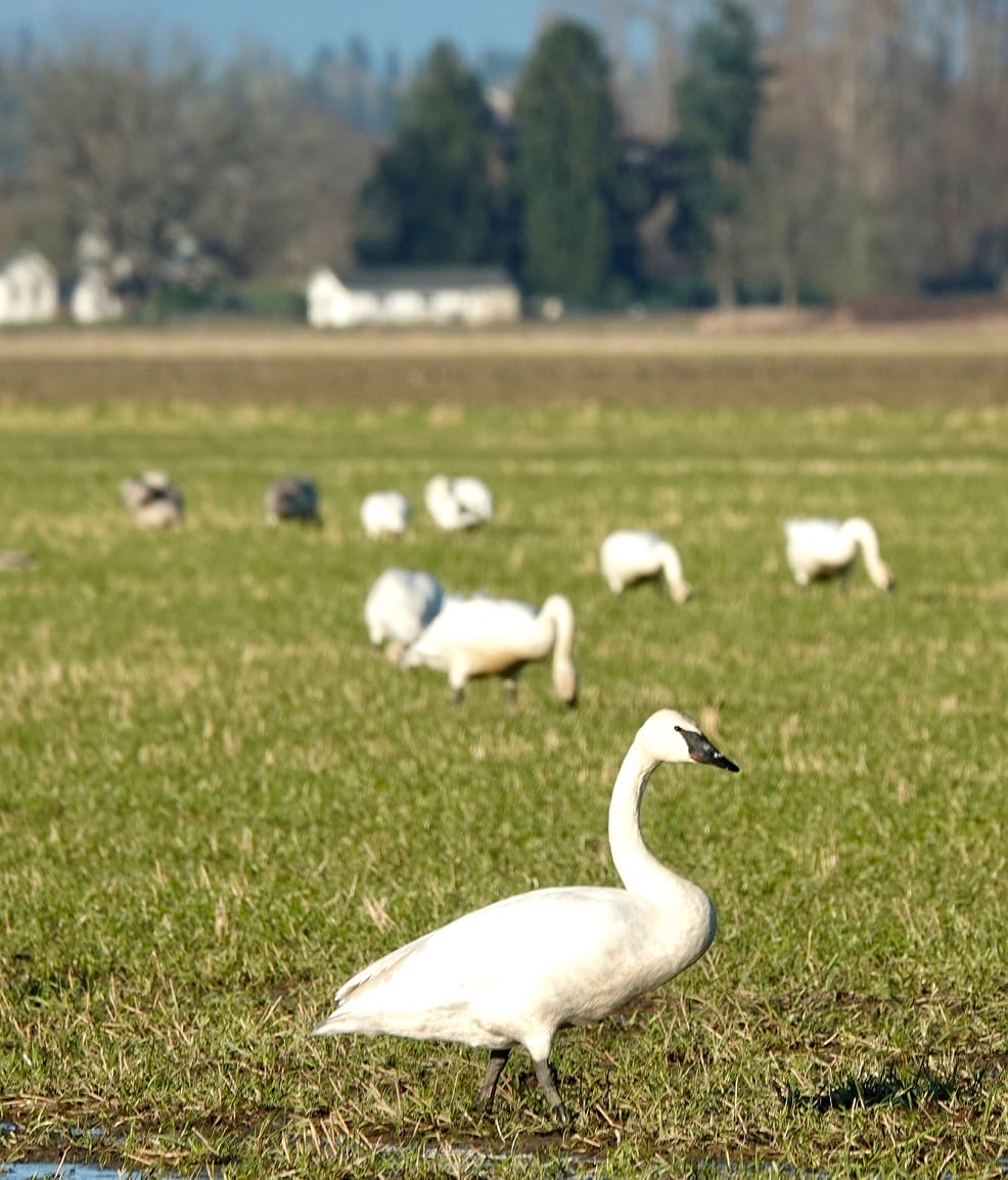 Today it got up to fifty degrees, no rain, and sunset was as late as 6 PM, so we decided to take a short day trip to spend some time in nature. We went up to a famous spot for bird watching, Skagit Valley, Washington, which gets snow geese, Trumpeter swans, tundra swans, who migrate, and eagles and herons year-round.