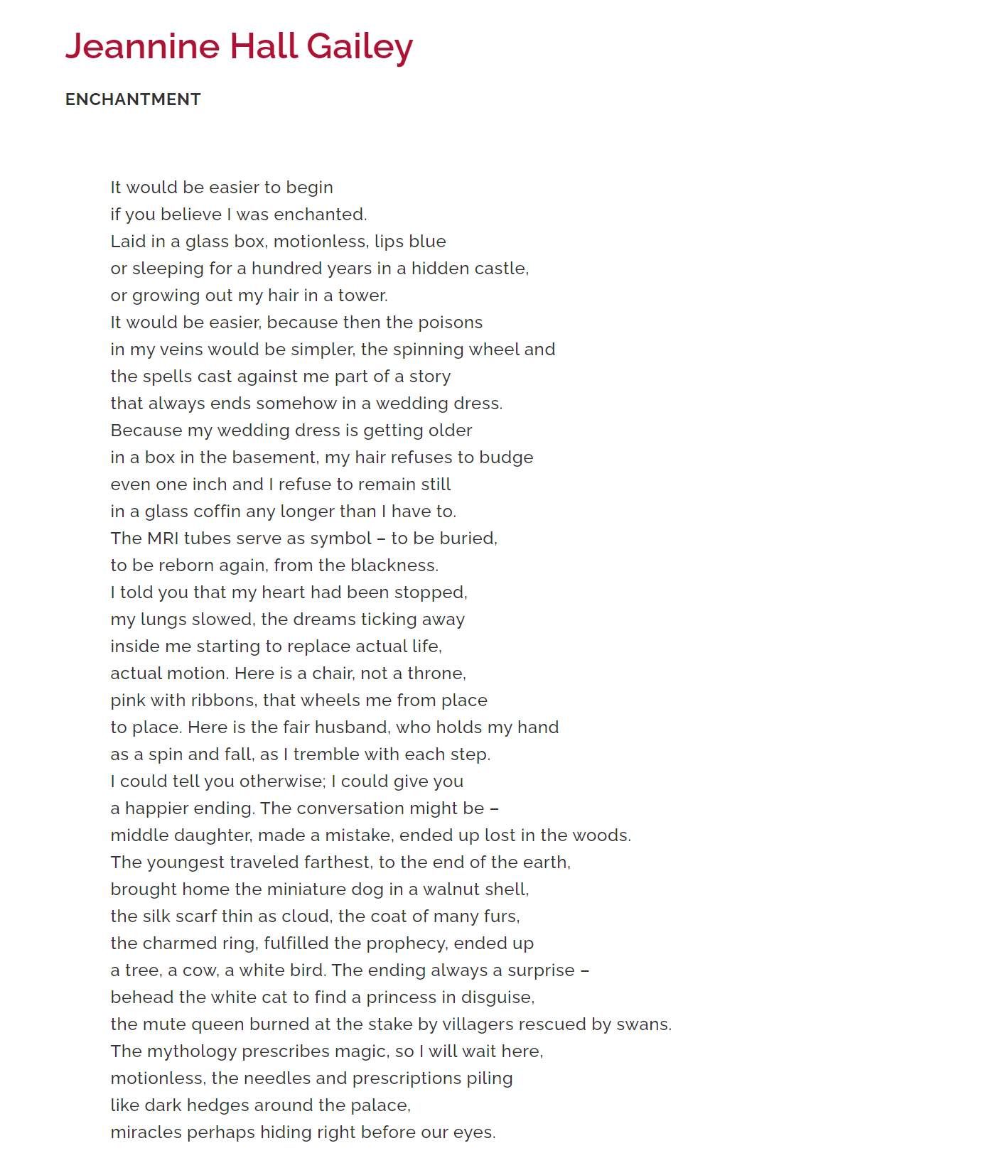 Jeannine Hall Gailey served as the second Poet Laureate of Redmond, Washington and the author of Becoming the Villainess, She Returns to the Floating World, Unexplained Fevers, The Robot Scientist’s Daughter, and winner of the Moon City Press Book Prize and SFPA’s Elgin Award, Field Guide to the End of the World. Her latest, Flare, Corona from BOA Editions, was a finalist for the Washington State Book Award. She’s also the author of PR for Poets, a Guidebook to Publicity and Marketing. Her work has been featured on NPR’s The Writer’s Almanac, Verse Daily and The Year’s Best Fantasy and Horror. Her poems have appeared in The American Poetry Review, Poetry, and JAMA.