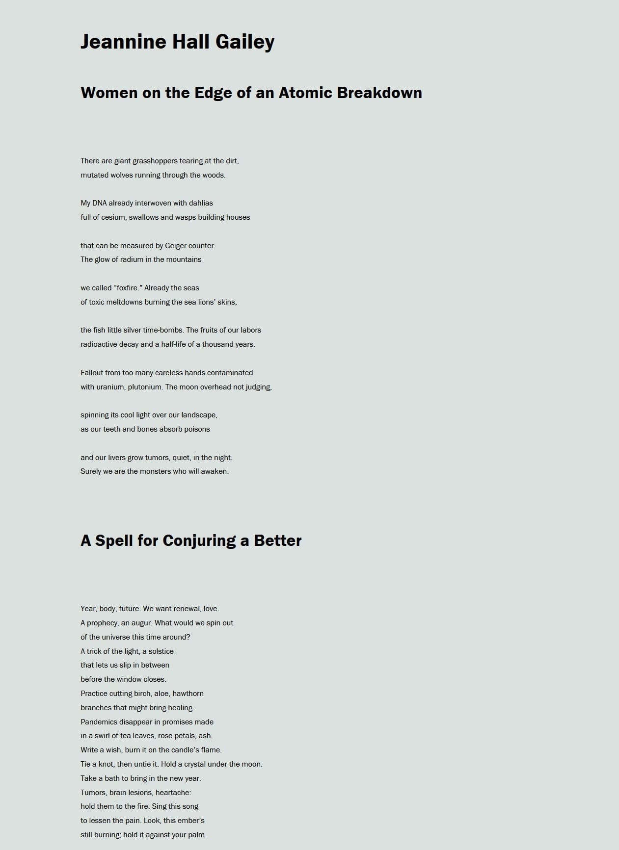 Then I had two poems appear in the gorgeous new Allium, in their Fall 2021 issue, “Women on the Verge of an Atomic Breakdown” and “Spell for Conjuring a Better…: