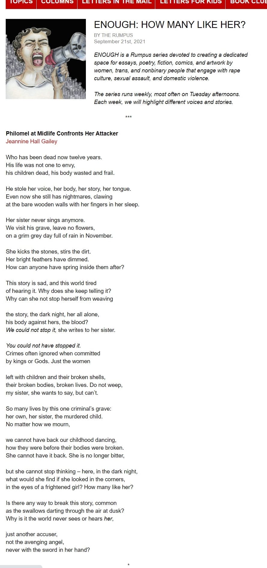 This week I had some happy poetry news in the form of poems being published. The first was “Philomel at Midlife Confronts her Attacker” in The Rumpus, along with some other terrific poems in their Enough series.
