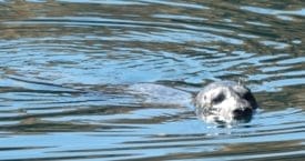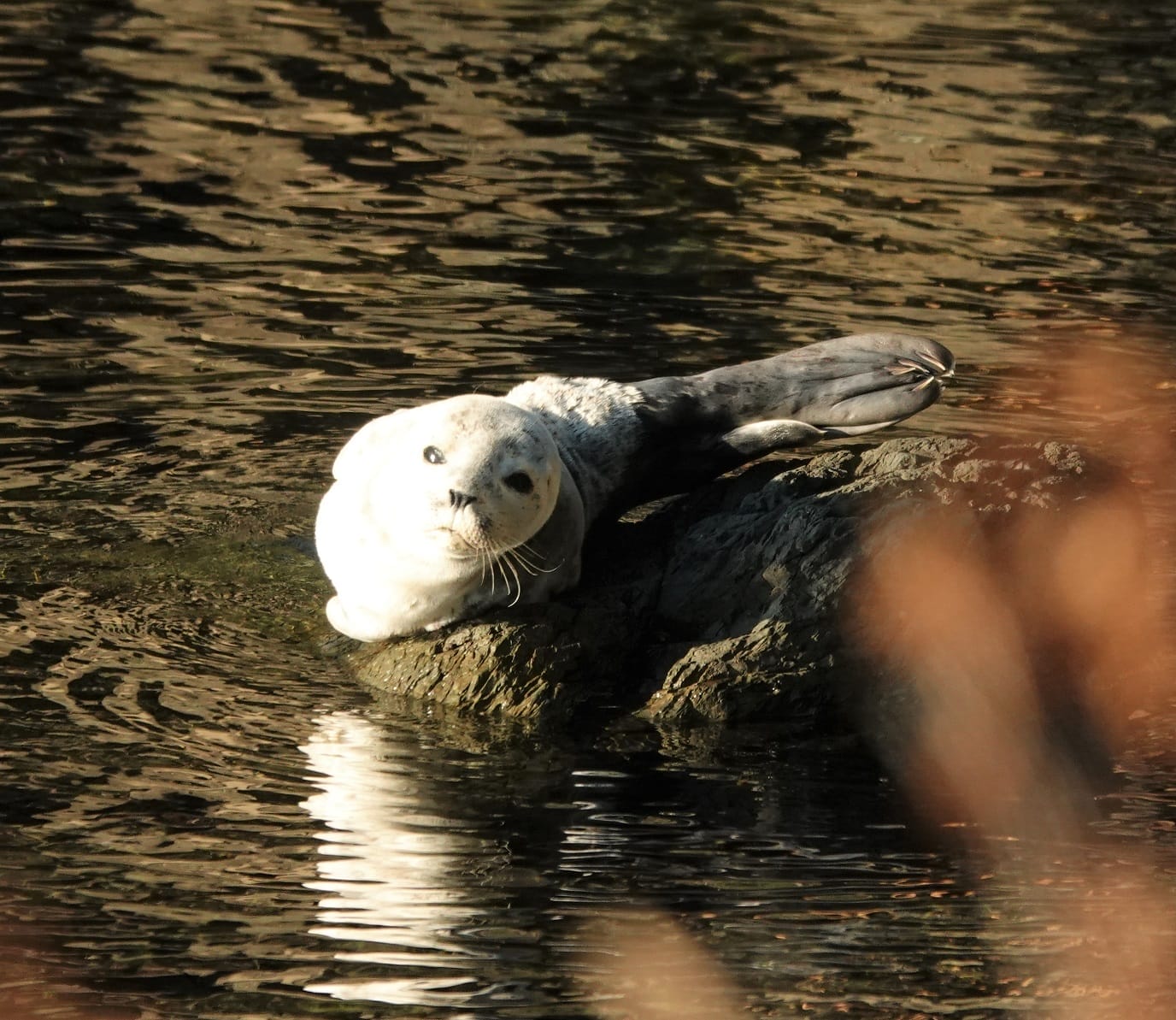 Like all good things, the residency at the Whiteley Center on San Juan Island had to come to an end. This picture is a view of the sunset on the ferry home form the San Juan Islands, maybe the most beautiful sunset we experienced the whole time. The last few days included multiple seal sightings – and seal pups – and a visit to an alpaca farm where I was sneezed on by an overly excited alpaca, and an incident getting stranded at the bottom of a very steep gravel hill in a wheelchair at English Camp – which was getting ready to close for the year, unbeknownst to us – and a rescue by an elderly woman who was a volunteer park ranger from East Tennessee in an ATV. Also, many hours gazing at beautiful vistas, visits to farm stands, and writing on my latest manuscript. Do I have pictures of all that? No I do not. But I do have at least two pictures of the baby seal!