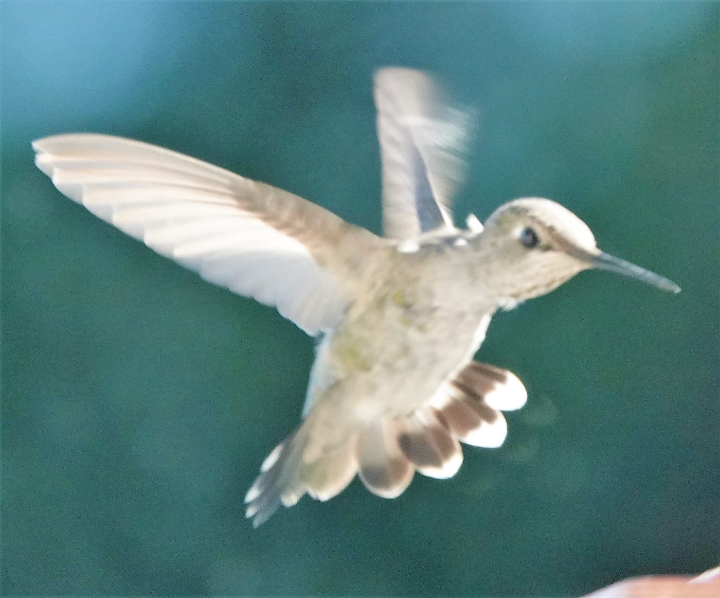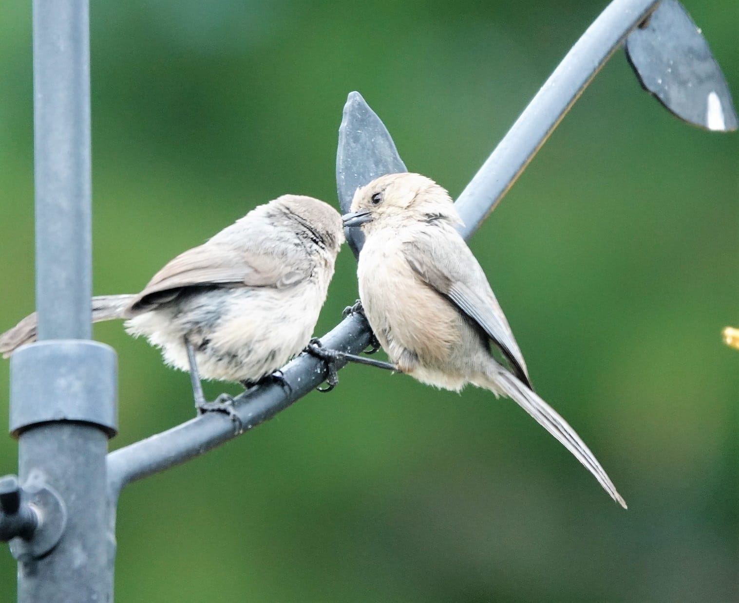 So we put out an extra birdbath with a solar fountain to provide extra water for our hummingbird population, and they love it! I see at least one hummingbird a way splashing through it. Bushtits are an underappreciated but adorable bird, in my opinion, so here’s a picture of a bushtit in flight and a mother bushtit feeding its baby.