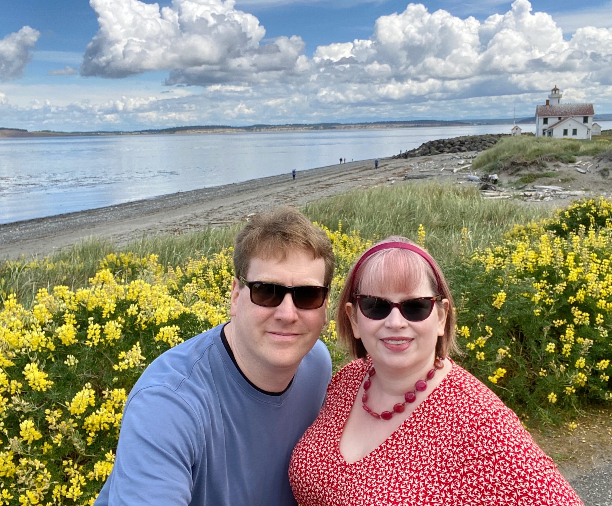 Glenn and I got to visit our favorite spots – Chetzemoka Park, the lighthouse at Fort Warden. We walked on the beach, and were surrounded by walls of yellow lupines, which smelled like honey and salt. We explored around Discovery Bay – the place we stayed had a beautiful overlook among historic cabins. The only thing we skipped were indoor things – no shopping or restaurants this time around, just in case. Visiting Port Townsend was like visiting an old friend – observing things that had closed, or that were still open, or how an old madrone tree had finally disappeared after all the years of clinging to the cliffside. Here’s where Glenn met a coyote on his bike, or where I encountered a white deer. Little things. But it did allow us to appreciate how much the ocean, the trees, just the chorus of frogs so loud at night and birdsong so loud in the morning, can shift perspective. I am always happier when I am close to nature. I don’t have a body that supports most rugged individual sports, but it does allow me, even with MS and all my other nonsense, to get close to seals, and swallows, and deer, and look at the sky overhead, and laugh when it rains on me even when it’s sunny (yes, it’s happening in quite a few of the pictures here.)