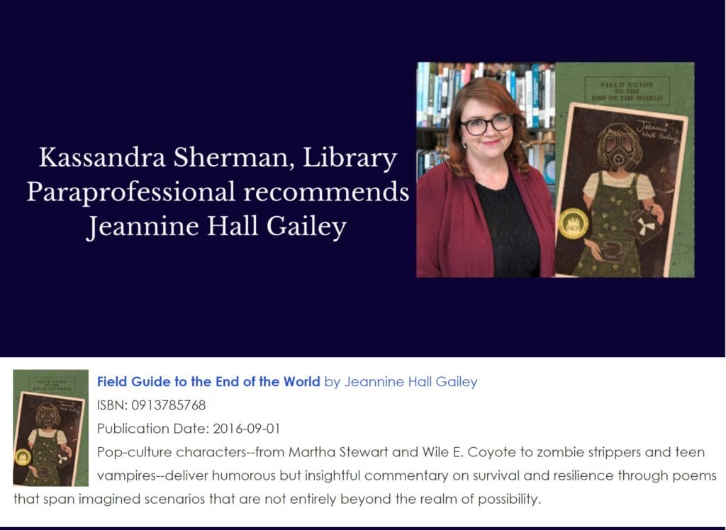 I was so happy to see that Field Guide to the End of the World was a Staff Pick among Librarians at St. Petersburg College. Even when a book has been out a few years, it’s especially happy-making when someone gives it a little attention. So thank you, Librarians (and Kassandra Sherman!) It’s National Poetry Month, so go ahead and buy some poetry to celebrate!