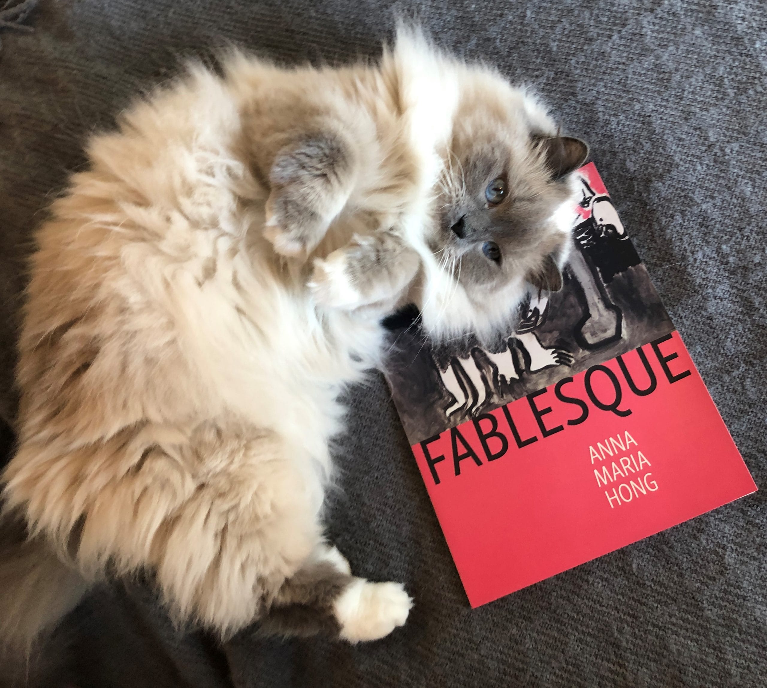 One of the kind gifts sent to me this week was Anna Maria Hong’s new book from Tupelo Press, Fablesque. If you enjoy fairy-tale-twisted poetry, mythology, experimental poetry, prose poetry, and harrowing tales of fathers escaping North Korea, this book is for you. I very much enjoyed it, and as you can see, Sylvia cuddled up to it right away.