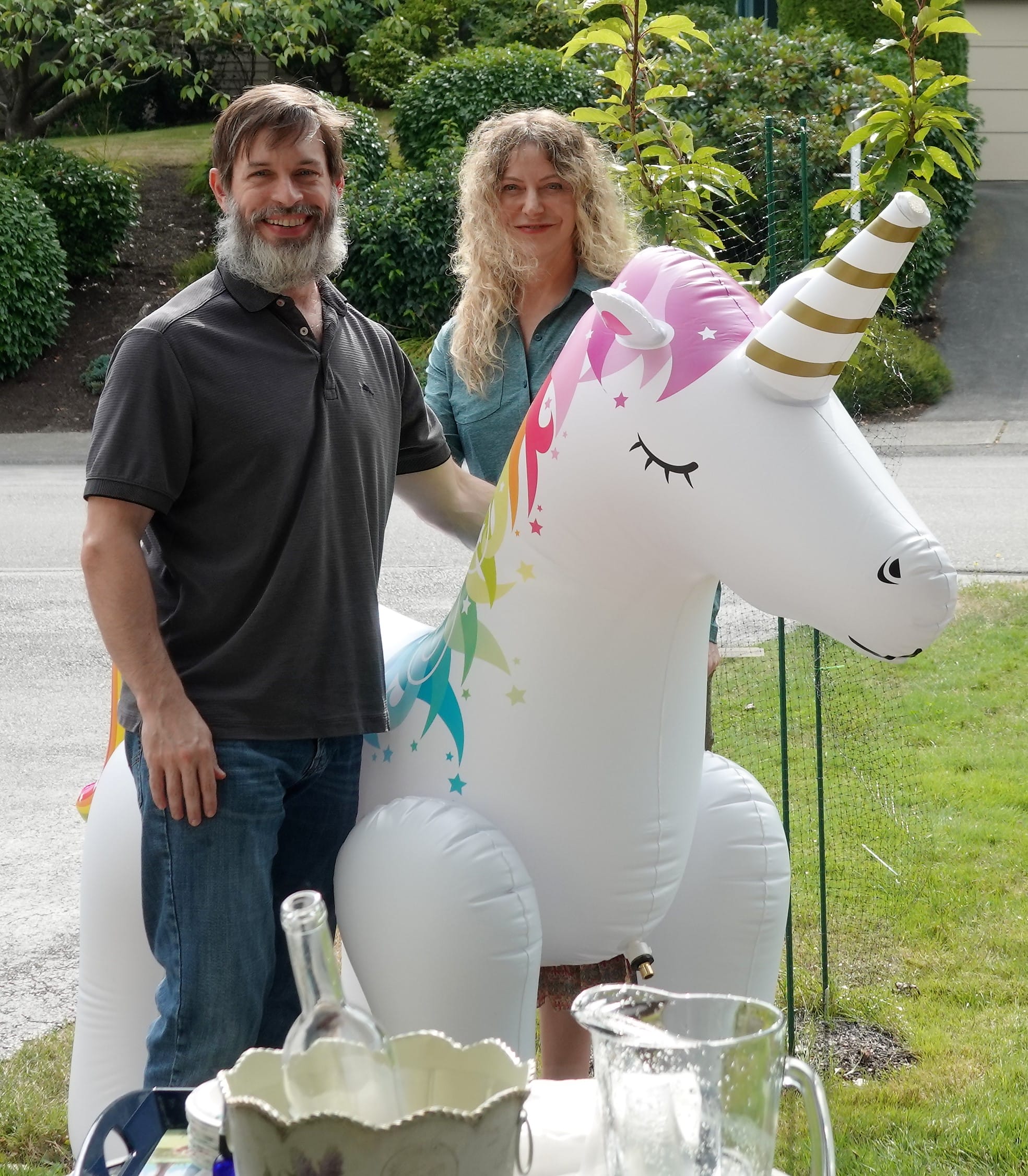- Mike and Glenn with unicorn sprinkler (Glenn is several feet behind Mike, not beside him, but the illusion is almost complete!)