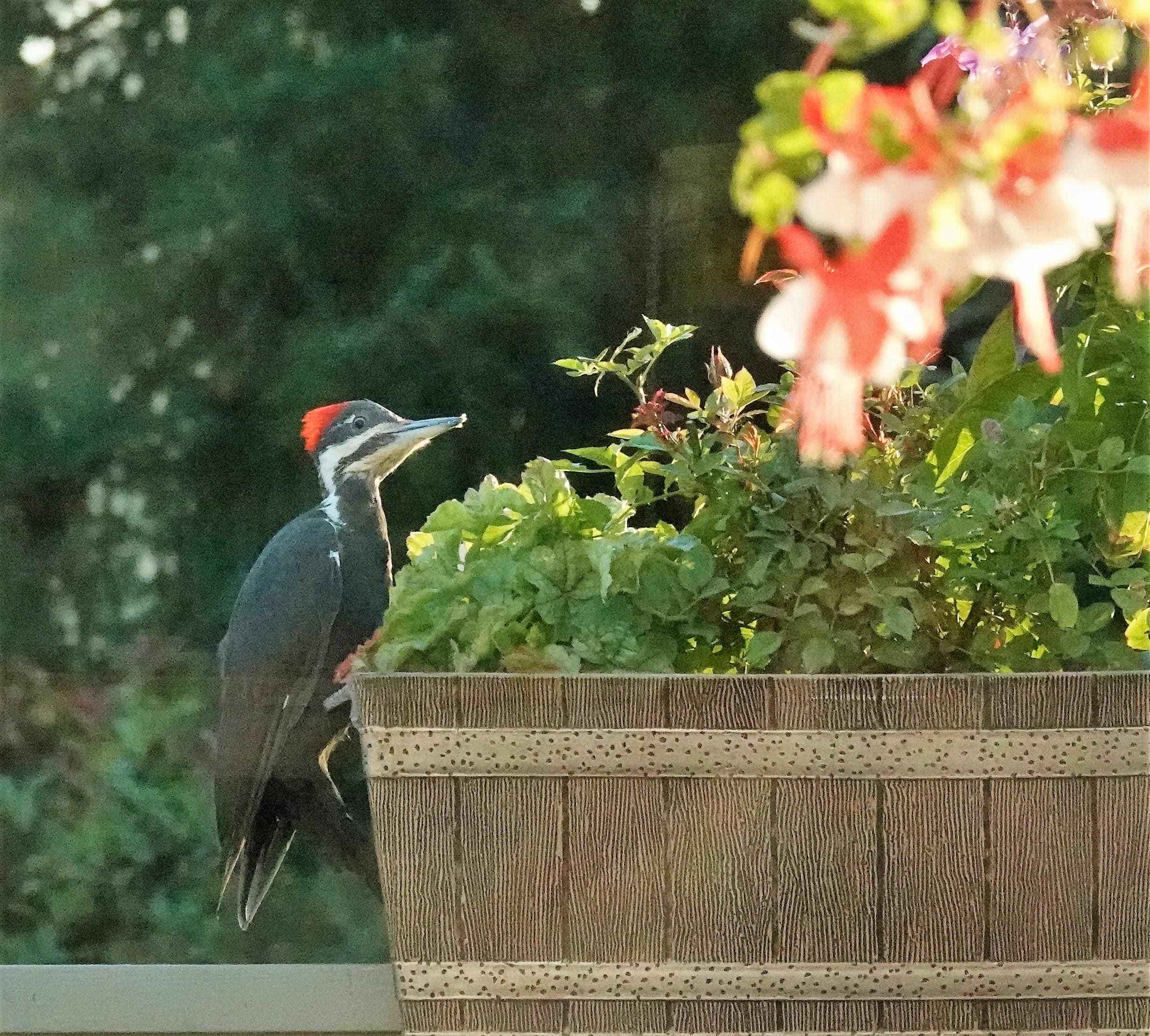 I have to admit these modest adventures – which felt risky to me, but rewarding – did lift my spirits. The week ahead promises to bring record-breaking heat (in the nineties) and more smoke, so I’ll probably be acting more Emily Dickinson-y than daredevil-y for the rest of the week, a good time to write and send out work, and spend time with my cats and my birds instead of humans. Here’s one of my regular visitors – a pileated woodpecker. This week I saw a V of snow geese migrating overhead, always a beautiful sight (if a bit cacophonous). The hummingbirds were persistently hanging around us this afternoon, fluttering in front of us and zipping from flower to tree branch. It was like they wanted to socialize too!