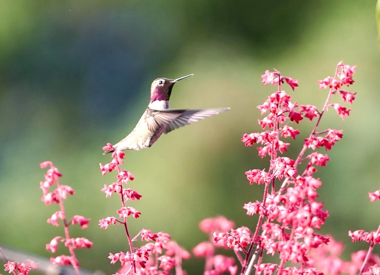 I had the pleasure of observing many hummingbirds as flowers on my back porch bloomed, with coral bells, snapdragons and fuchsias. There were immature and mature Anna’s and Rufous hummingbirds. We also had the return of black-headed grosbeaks and finches and mornings and evenings, even during rain, have been full of birdsong. I hope these pictures bring you a little joy.