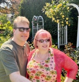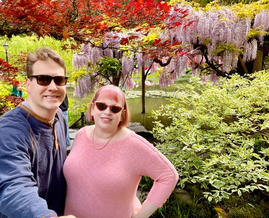 - Glenn and I with wisteria and iris