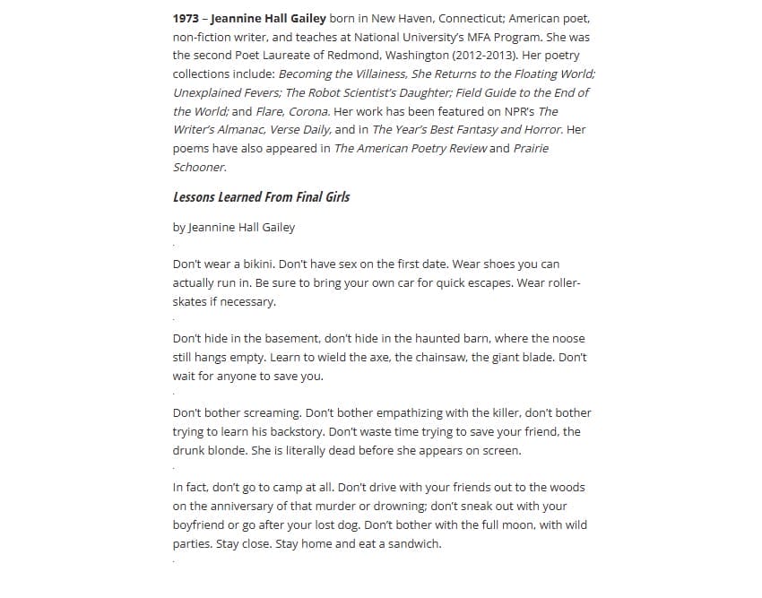 Imagine my surprise when I discovered my poem, “Lessons You Learn from Final Girls,” from Field Guide to the End of the World, was up on the Daily Kos this week (right after Yusef Komunyakaa, whose birthday is apparently a day before mine) as birthday poets. See the link here.