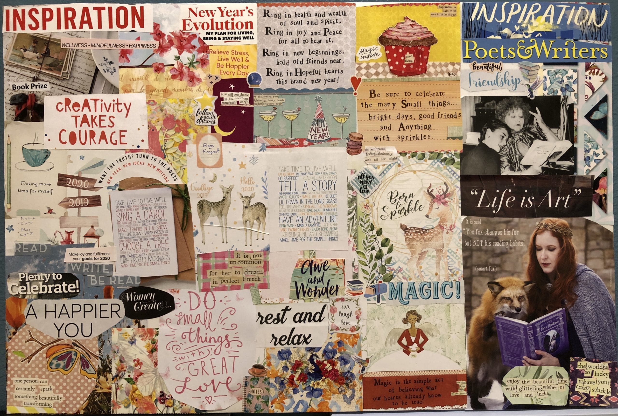 On that note, here is my finished version of the Vision Board I made for 2020. Note there are three deer, one fox, one peacock, and several hummingbirds. I’m not sure what the significance of this is but I’m sure some subconscious symbolism is at work. Wishing you all a happy New Year’s and a hopeful, inspired 2020!