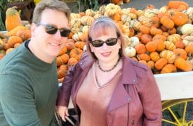- Glenn with pumpkin patch sign and me with plush pumpkin at Molbaks