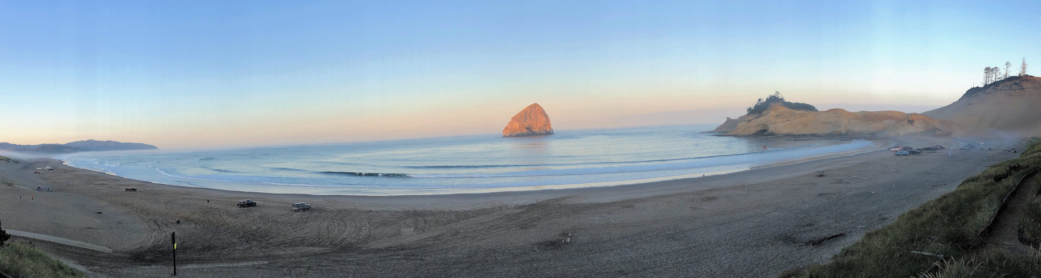 Just returned from the Oregon Coast – Pacific City, to be exact – where we had this review of a giant sand dune and Haystack Rock each morning and evening from our balcony. Pacific City – which can be reached only with a five and a half hour drive, the last hour of which was a hairpin turned, one-lane bridged mountain road driving – complete with washed-out roads and steep drop offs – almost reminded me of driving through the mountains in Tennessee only to wind up in California. The rocky dunes and steep cliffs, the scrub brush, the surfers – definitely echoed the beaches in northern California. Maybe a little like Big Sur – the lush growth of mountain trees, ending in a spectacular stretch of beach.