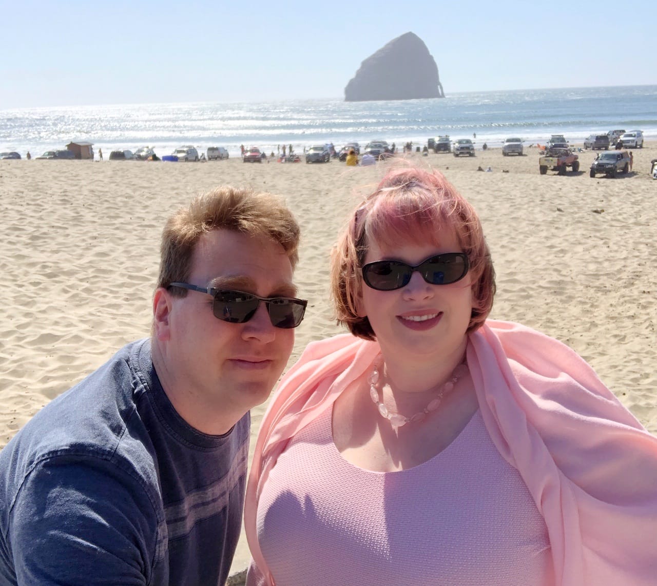 - Glenn and I on the beach, with Haystack Rock and dunes