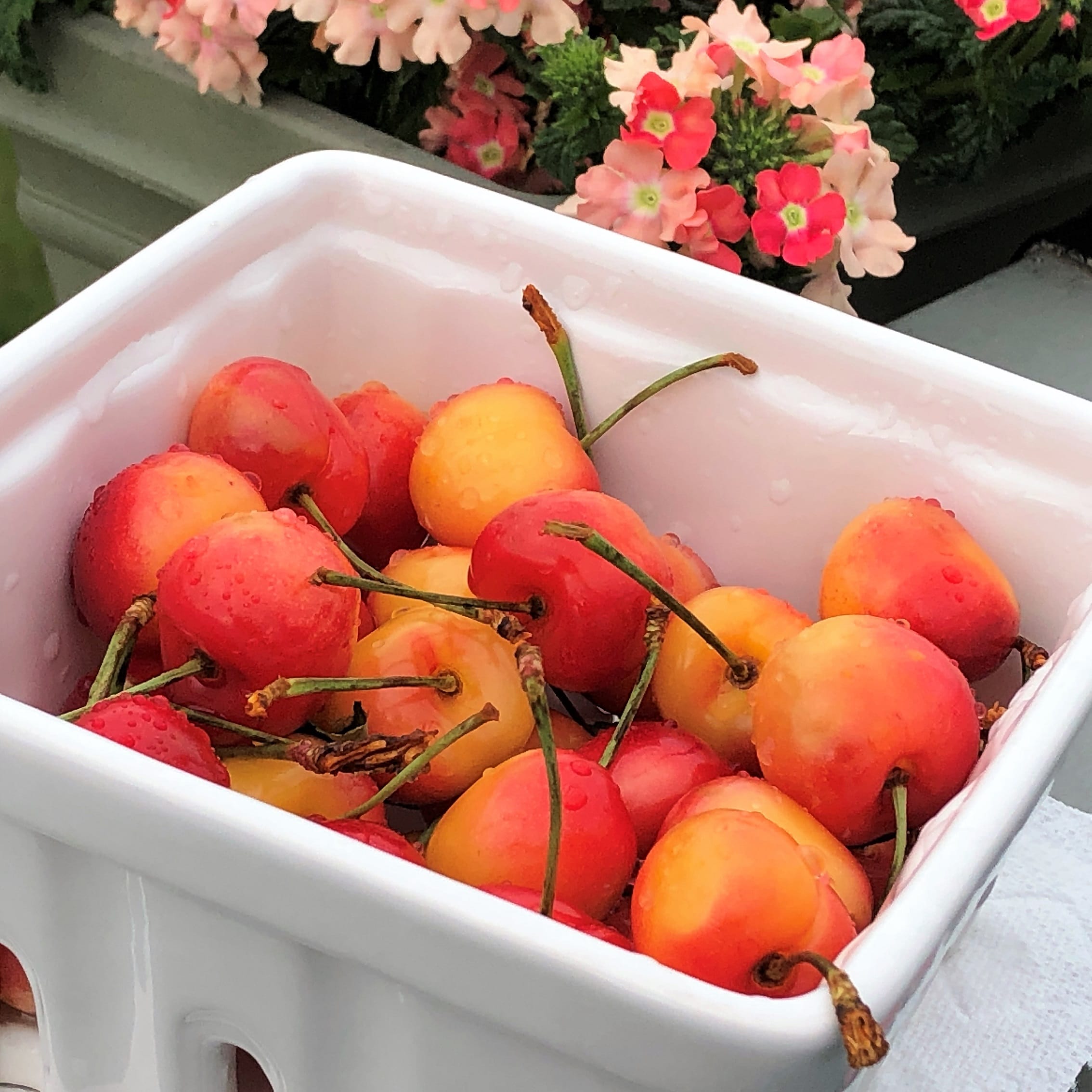 We stopped by a roadside cherry stand yesterday and picked up a pint of Rainier cherries for $4. That is how you can tell it’s summer in Seattle! It may be 60 degrees and rainy, but those Rainier cherries are a beautiful seasonal harbinger. And they are so delicious. I missed them so much the two years I lived in California. California may be the state of fresh produce, but they just don’t offer anything like Washington State Rainier cherries. We cook them and serve them over Greek yogurt for breakfast or put them into muffins or just eat them plain and unadorned. There are almost never enough to make into a cherry pie, believe it or not. These cherries disappear fast!