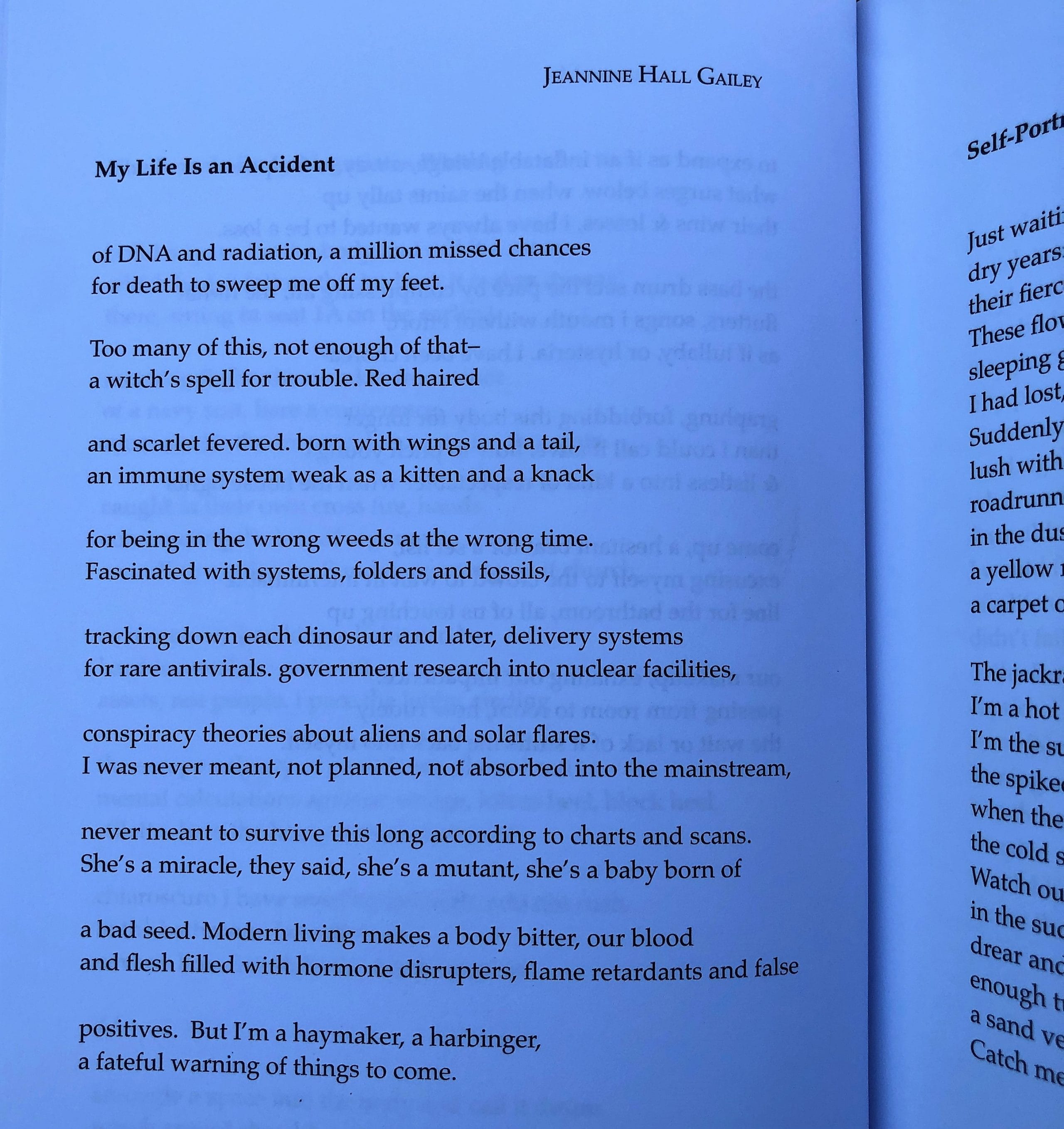 I am very excited to share that I have four poems from my newest manuscript in the Summer 2019 issue of Spoon River Poetry Review. Here’s Sylvia posing with her copy and a peek at one of the poems, “My Life Is an Accident.” The sunlight turned it blue!